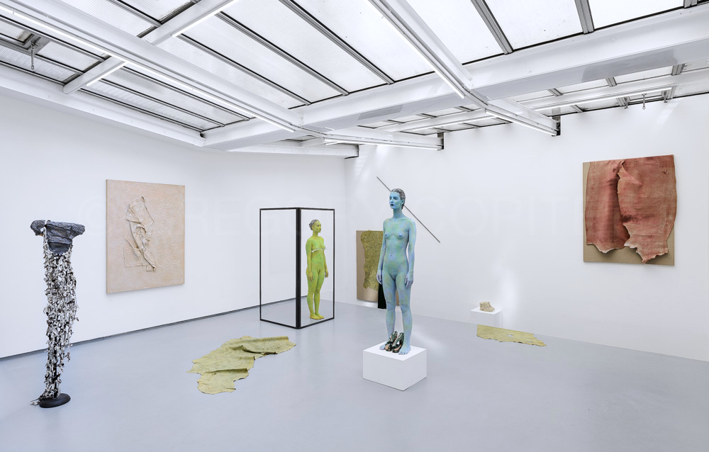The artist’s large-scale installations combine tactile materials,  clothing, shoes, fabrics or found objects, which she deconstructs and freezes in the painting. Recombined with plastic or latex materials, or superimposed in layers on stretchers, the used or worn objects give rise to new artefacts. Linked in space through a network of semantic and plastic connections, the static elements are activated during performances, in which living models, infused and crystallised in the installation, start interacting with the works.